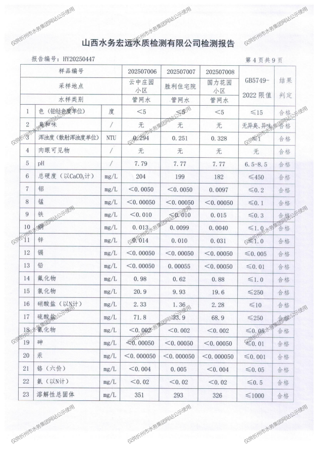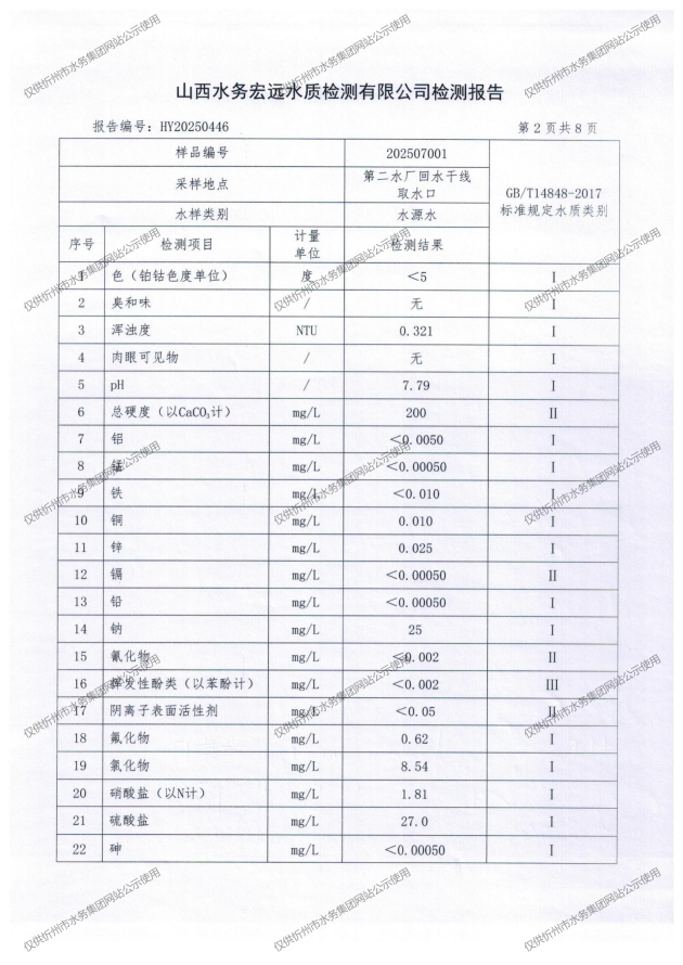 忻州城區(qū)公共供水水源水、出廠水、管網水、管網末梢水2025年7月份水質信息公示