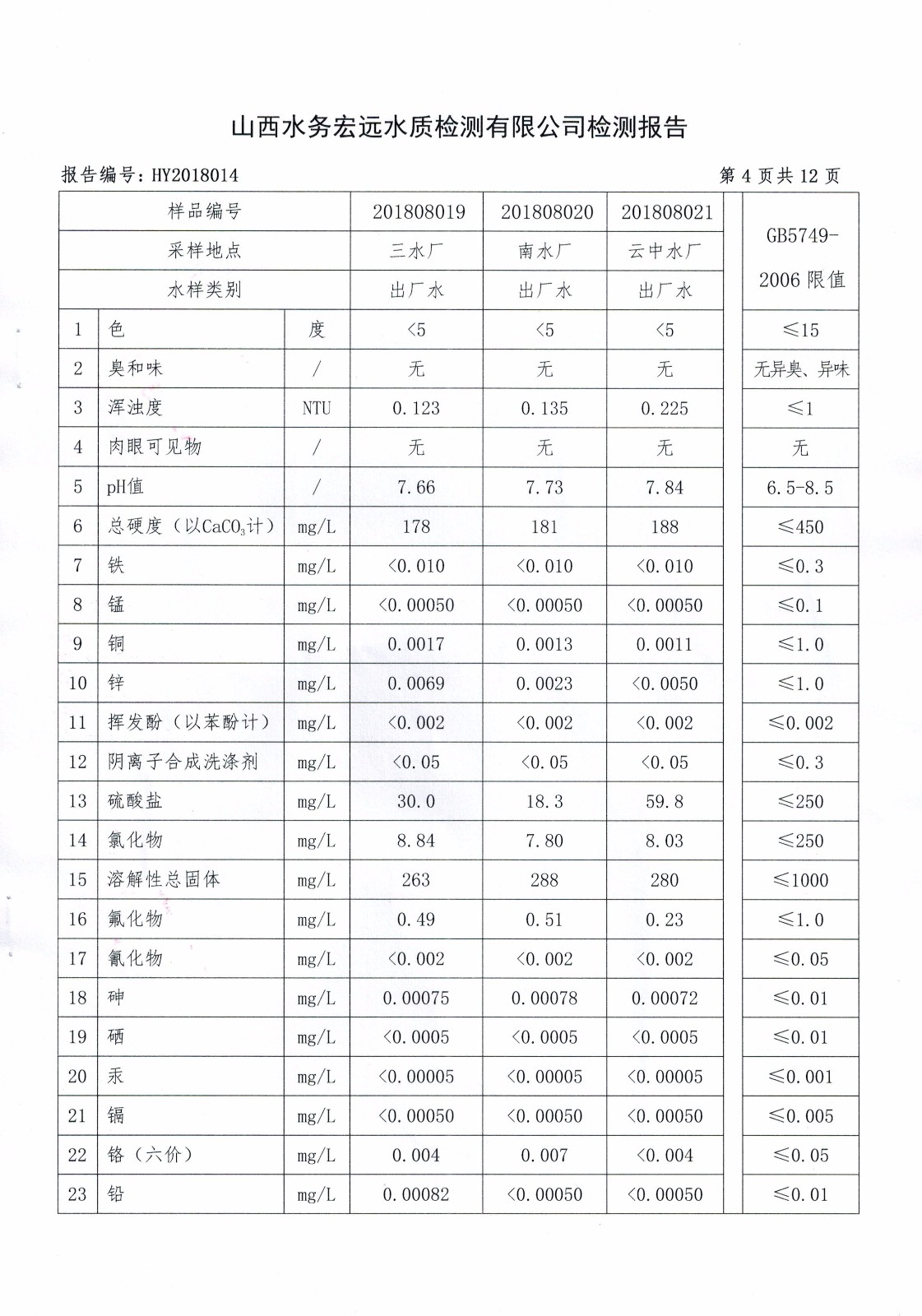 忻州城區(qū)公共供水水源水、出廠水、管網(wǎng)水、管網(wǎng)末梢水2018年8月份水質信息公示