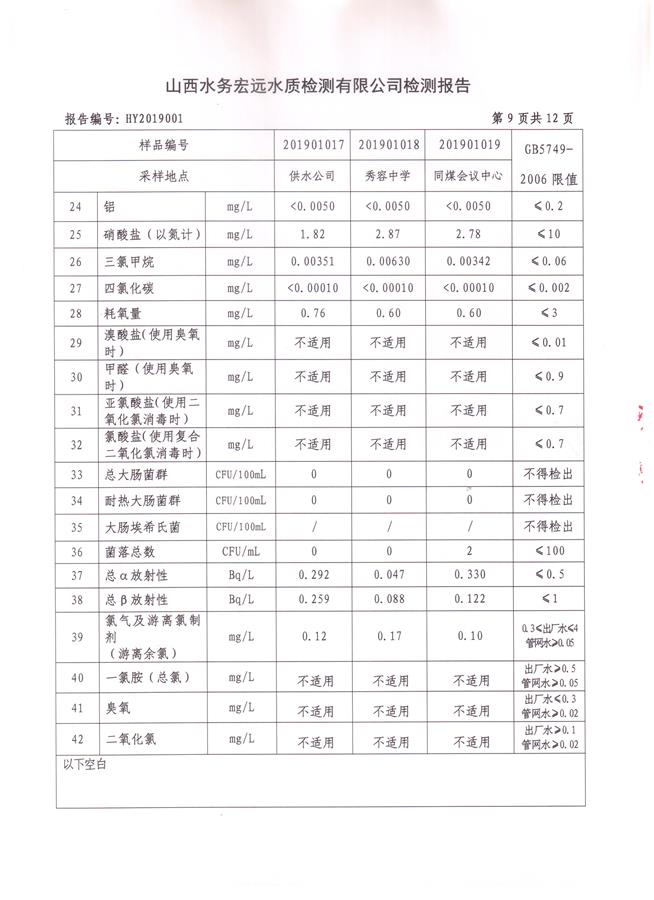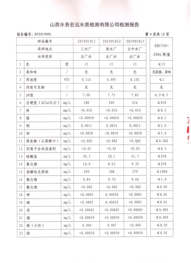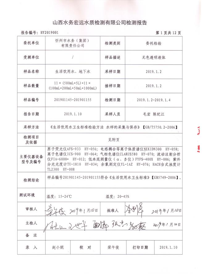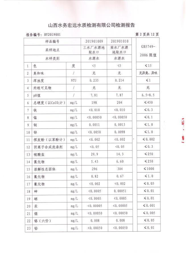 忻州城區(qū)公共供水水源水、出廠水、管網(wǎng)水、管網(wǎng)末梢水2019年1月份水質(zhì)信息公示