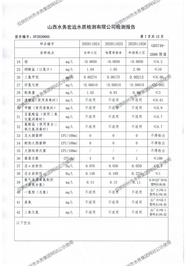 忻州城區(qū)公共供水水源水、出廠水、管網(wǎng)水、管網(wǎng)末梢水2020年11月份水質(zhì)信息公示