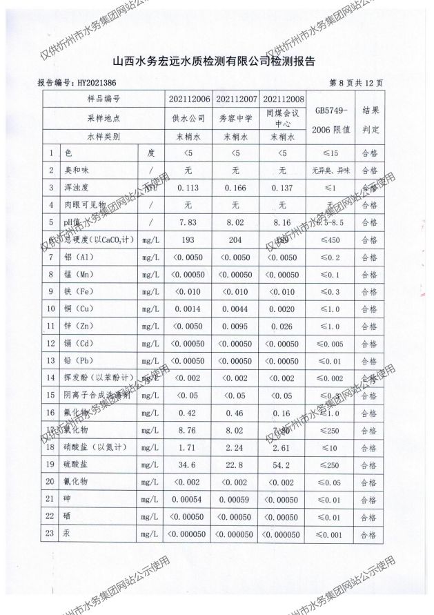忻州城區(qū)公共供水水源水、出廠水、管網(wǎng)水、管網(wǎng)末梢水2021年12月份水質(zhì)信息公示
