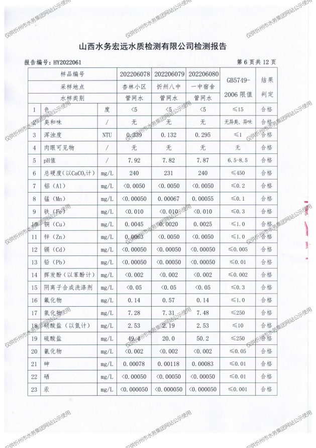 忻州城區(qū)公共供水水源水、出廠水、管網(wǎng)水、管網(wǎng)末梢水2022年6月份水質(zhì)信息公示