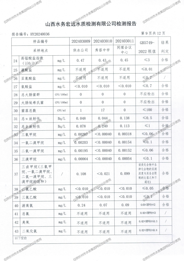 忻州城區(qū)公共供水水源水、出廠水、管網(wǎng)水、管網(wǎng)末梢水2024年3月份水質(zhì)信息公示
